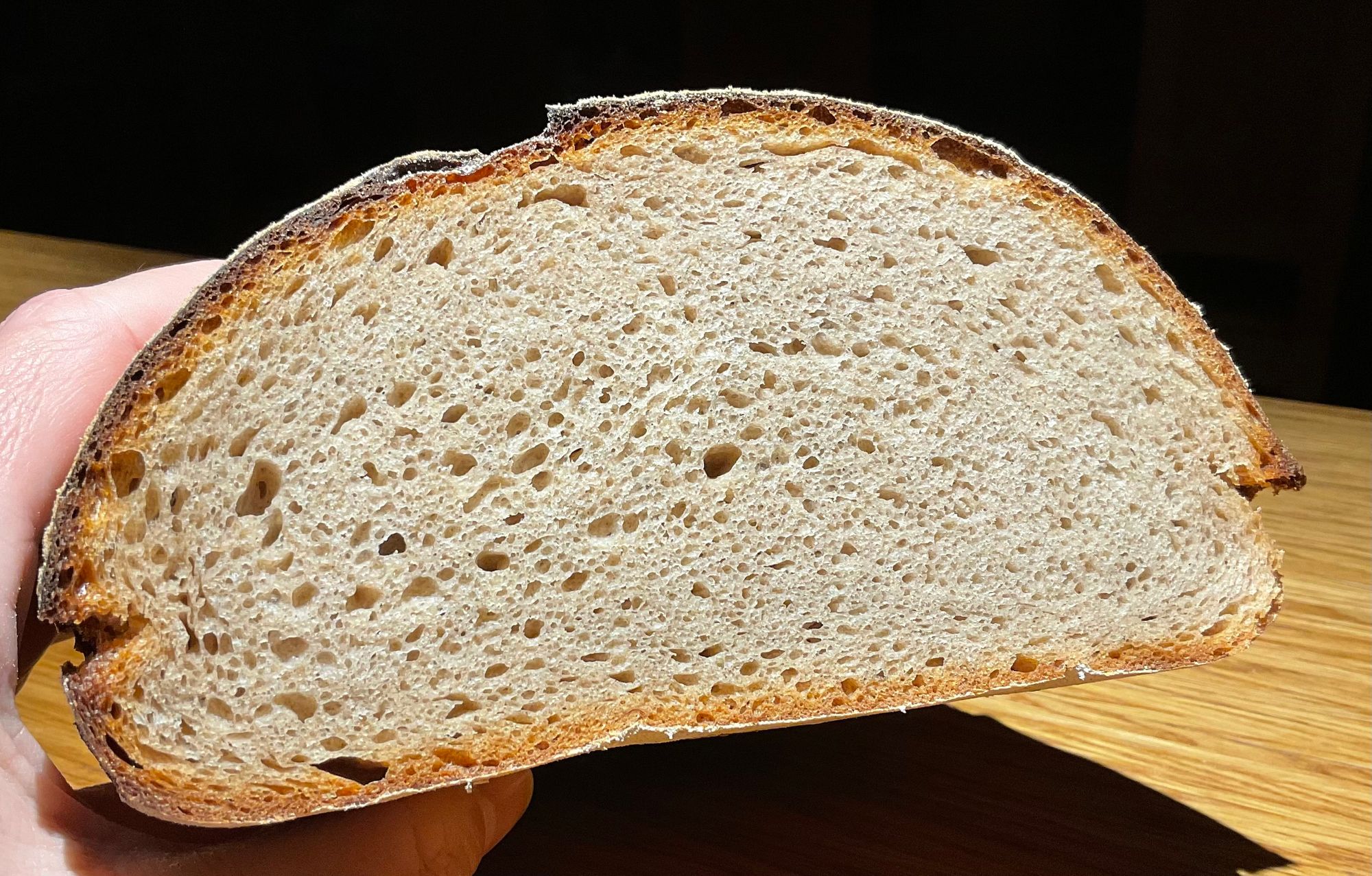 Alle Zutaten des Hauptteigs vermengen und circa 8 Minuten auf niedriger Stufe kneten. Danach 2 Minuten auf höhere Stufe ausgewiesen. Der Teig ist sehr klebrig. Im Anschluss den Teig mit der Hand rund wirken und 1 Stunde reifen lassen. Für die Stückgare den Teig noch ein weiteres Mal rund wirken. Den Teig einige Minuten entspannen lassen. Im Anschluss wird der Teig lang gewirkt. Der Teig kommt nun mit dem Schluss nach unten ins bemehlte Gärkörbchen. Wenn sich das Volumen des Teigs ungefähr verdoppelt hat, wird er auf den Teigschieber gestoßen und eingeschnitten. Der Teig wird bei 250 °C auf dem heißen Backstein gegeben. Sofort schwaden und den Schwaden, nach circa 6 Minuten wieder ablassen. Nach 10 Minuten wird die Temperatur auf 235 °C herabgesetzt. Die Backzeit beträgt 50 Minuten.